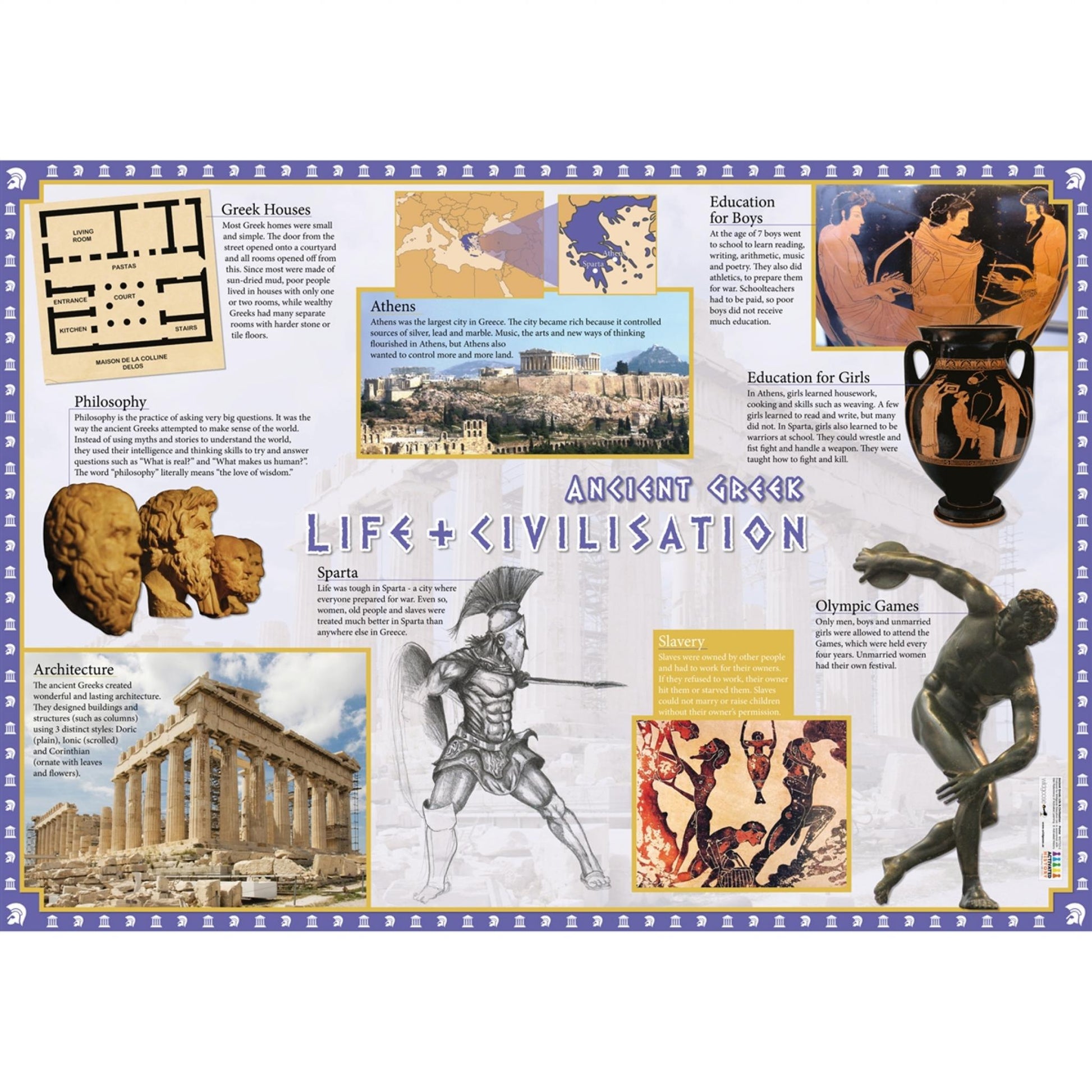 Two A1 Posters packed with information, maps, photographs, illustrations and facts about the Ancient Greeks, their life and civilisation, religion and lasting legacy.